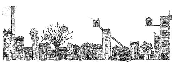– Что есть, то есть, что и говорить, – с готовностью отозвался Обадэй. – Впрочем, по большей части они вовсе не пустые, скорее пустующие. Доступ открыт для всякого. Для путешественников, для каких-нибудь компаний, для нищих. В общем, для временного пользования. Теперь мы находимся на проспекте, который называется Сбродвей. А это Скипидаровое шоссе. А там вон переулок Зубодробителей.