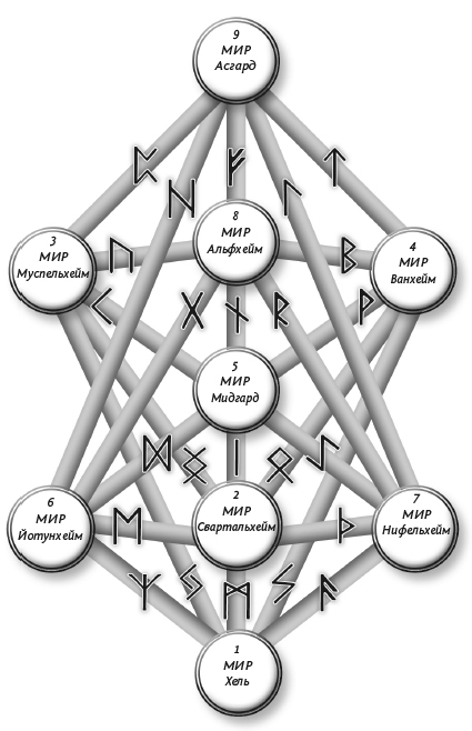 В мифологии каждый мир имеет свой облик, историю и обитателей – великанов, людей, богов. В магическом же смысле каждый мир – это особое состояние, которому соответствует тот или иной потенциал и спектр вопросов. Каждый мир отвечает за какой-то процесс в нашем мышлении и по-своему раскрывает заряд рун. В одном мире энергия руны может действовать благоприятно, а в другом вредоносно. Один мир может помогать, а другой создавать препятствия.