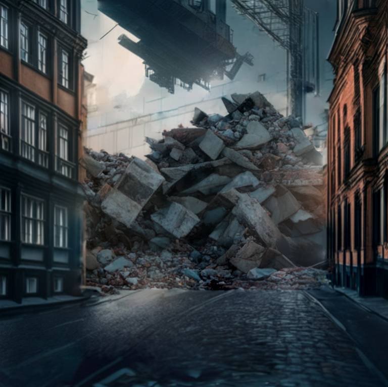 Миновав пару кварталов, напоролся на свежие руины, и стала понятна причина «метеоритных ударов» – из развалин жилого дома торчали уродливые остатки огромного ангара от небесного промышленного монстра.