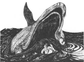 Then the Whale opened his mouth back and back and back till it nearly touched his tail, and he swallowed the shipwrecked Mariner, and the raft he was sitting on, and his blue canvas breeches, and the suspenders (which you must not forget), and the jack-knife – He swallowed them all down into his warm, dark, inside cupboards, and then he smacked his lips – so, and turned round three times on his tail.