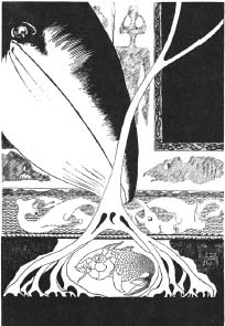Here is the Whale looking for the little ’Stute Fish, who is hiding under the Door-sills of the Equator. The little ’Stute Fish’s name was Pingle. He is hiding among the roots of the big seaweed that grows in front of the Doors of the Equator. I have drawn the Doors of the Equator. They are shut. They are always kept shut, because a door ought always to be kept shut. The ropy-thing right across is the Equator itself; and the things that look like rocks are the two giants Moar and Koar, that keep the Equator in order. They drew the shadow-pictures on the Doors of the Equator, and they carved all those twisty fishes under the Doors. The beaky-fish are called beaked Dolphins, and the other fish with the queer heads are called Hammer-headed Sharks. The Whale never found the little ’Stute Fish till he got over his temper, and then they became good friends again.