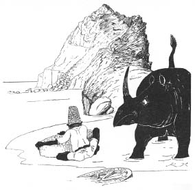 The black thing in the water close to the shore is not a wreck at all. It is Strorks the Rhinoceros bathing without his skin. He was just as black underneath his skin as he was outside. I wouldn’t ask anything about the cooking-stove if I were you.