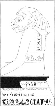 This is Wise Baviaan, the dog-headed Baboon, who is Quite the Wisest Animal in All South Africa. I have drawn him from a statue that I made up out of my own head, and I have written his name on his belt and on his shoulder and on the thing he is sitting on. I have written it in what is not called Coptic and Hieroglyphic and Cuneiformic and Bengalic and Burmic and Hebric, all because he is so wise. He is not beautiful, but he is very wise; and I should like to paint him with paint-box colours, but I am not allowed. The umbrella-ish thing about his head is his Conventional Mane.