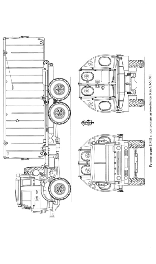 Речное звено состоит из четырех понтонов (двух крайних и двух средних), понтонных механизмов и устройств, межпонтонных механизмов и устройств и съемной оснастки. Если опять же сравнить с прежними парками, то в ПМП четыре понтона, у которых палуба является проезжей частью перевозятся на автомобиле, то до него требовалось 4 автомобиля для перевозки понтонов и как минимум один-два автомобиля для перевозки прогонов и настила.