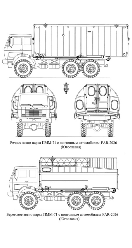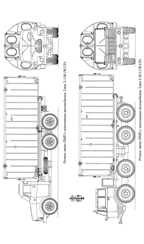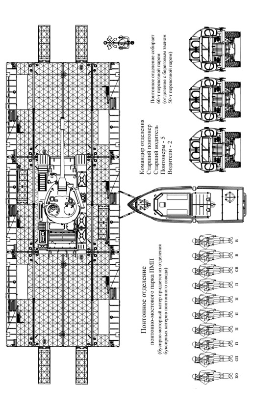 Все замки на звене закрываются не выходя за пределы палубы, с помощью понтонного рычага, для чего два понтонера (расчет одной машины без водителя) закрывают два палубных и два днищевых замка, потом стыкуясь с соседними звеньями, закрывают два нижних стыковых устройства и два стягивающих устройства. До ПМП, во всех без исключения парках (с небольшой разницей), после сброса (выгрузки, подноски) понтона на воду, расчет понтона стыковыл его с соседними (от двух до четырех понтонов) с помощью стыковых замков («большой болт с гайкой»). Укладывал на него прогоны, (минимум четыре) которые тоже надо было выгрузить и перенести на понтоны, после чего они крепились к понтону стрингерными болтами (сейчас это закрыть всего четыре замка). Затем надо было состыковать эту конструкцию с соседней, соединить каждый прогон несколькими замками («болтами»), выгрузить и уложить настил (огромное количество досок), прижать его пажилинами и закрепить пажильными болтами, а в ПМП это опять закрыть четыре замка. При этом я не упомянул съемную оснастку, которая в старых парках перевозилась отдельно, а в парке ПМП она в составе звена. После принятия на вооружение парка ПМП, наиболее прогрессивный до него парк ТПП довольно быстро был убран на хранение и не использовался, как и не изучался в военных училищах по причине сложности работы с ним войсках. Армии нужны были быстрые переправы, и ПМП совершил огромный прыжок вперед. На сравнительных сборных схемах мостов и паромов я наглядно показал, насколько мощным был этот прыжок.