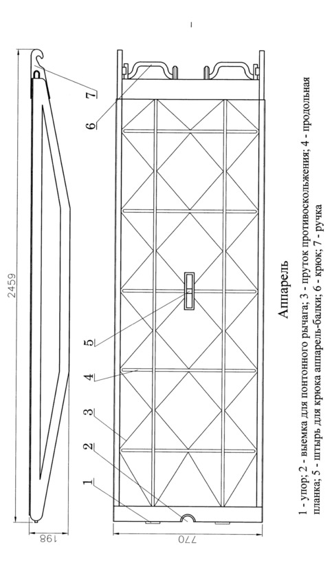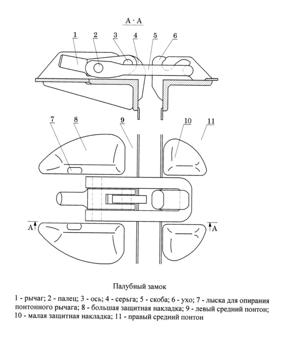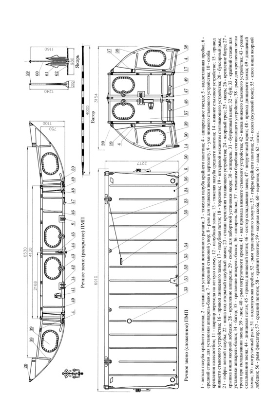 Крайние понтоны соединяются со средними (в плоскости палубы) с помощью трех палубных петель и в плоскости днища замыкаются двумя днищевыми замками.