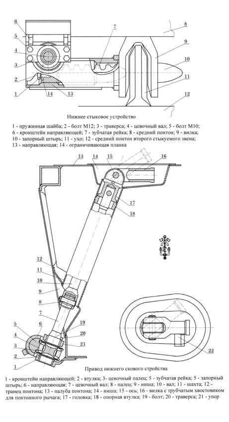 Для стыкования звеньев между собой служат нижние стыковые устройства и стягивающие устройства на крайних понтонах (в войсках их называют верхними стыковыми устройствами).