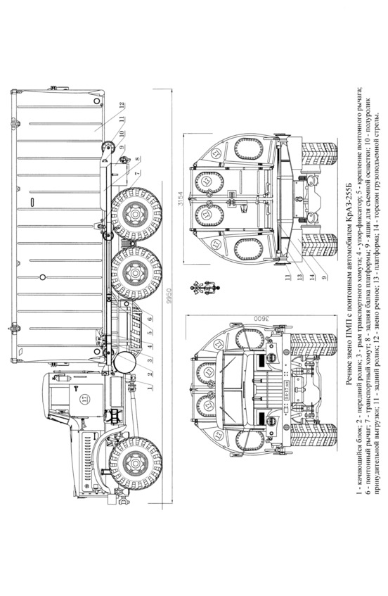 Крайние понтоны, как и средние, разделены на два отсека. Крайний понтон имеет две палубы – тяжелую и легкую. Тяжелая палуба имеет туже толщину, что и у среднего понтона. В нише легкой палубы крайнего понтона располагается якорная лебедка.