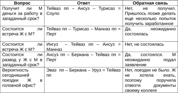 Данный раздел содержит обобщенное описание событийных случаев, характерных для каждой руны в раскладах различной направленности. Все иллюстрирующие случаи и примеры взяты из собственной практики.