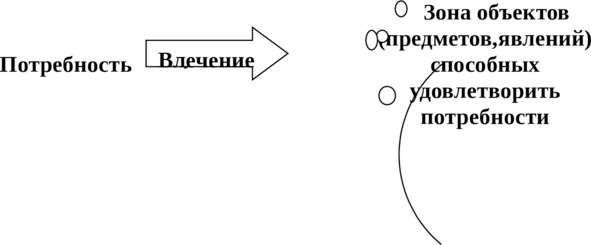 Замысел деятельности возникает, если есть потребности, подкрепленные определенными побуждениями (мотивами:, интересами, стремлениями, влечениями и др.). В этом случае возникает зона объектов (предметов), способных удовлетворить эти потребности, т.е. возникает определенная, но все еще не конкретизированная мотивация. Рис.6.6