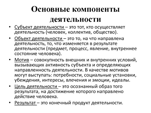 Действие (мысленное или практическое) – является главной структурной единицей любой деятельности и мотивировано на достижение промежуточных и конечных целей деятельности.