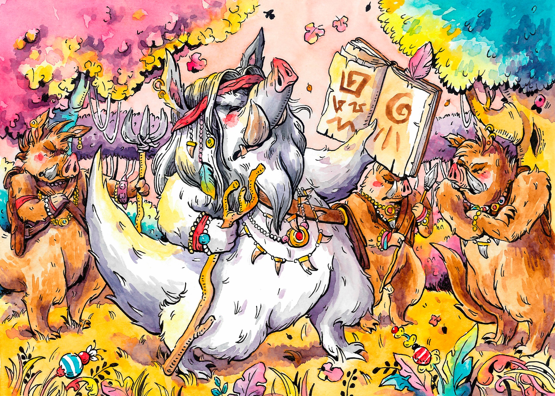 Мудрейшна запустил лапу под длинную седую шерсть и достал оттуда кожаную сумку. Опираясь на посох, он неуклюже открыл её зубами и вытряхнул книгу. Чешуйчатый переплёт играл на солнце радужными бликами. Обложку украшал знак, в котором узнавались пятачок и два кабаньих клыка.