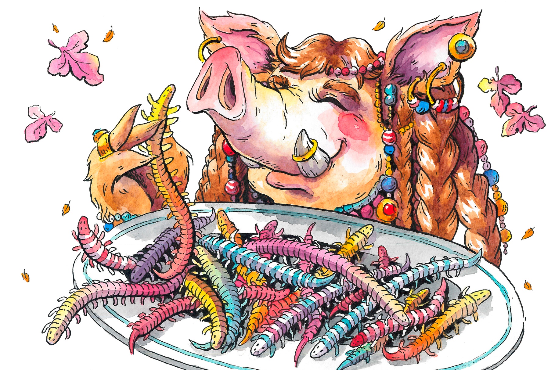 – Конечно, конечно! – снова низко поклонился Мудрейшина. – Но как же угощения? – он стукнул посохом, и тут же из-за его спины выбежали кабанозаврихи, протягивая гостям глубокие блюда. В блюдах извивались и щёлкали челюстями разноцветные скользкие многоножки.