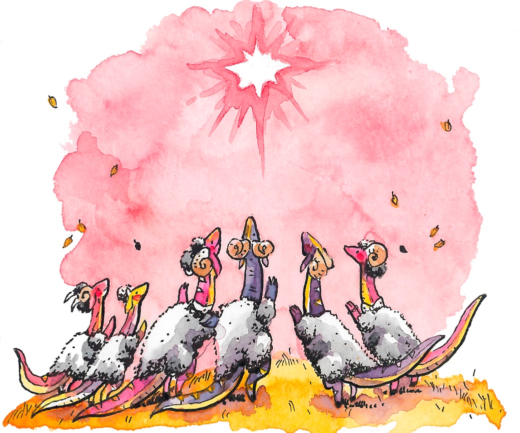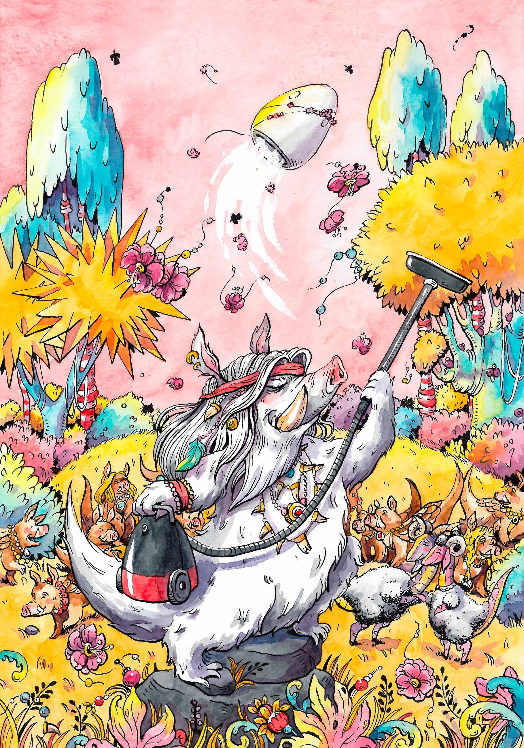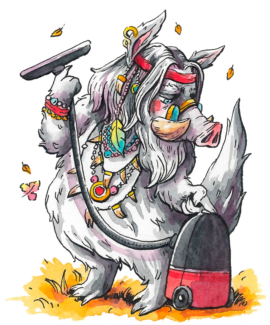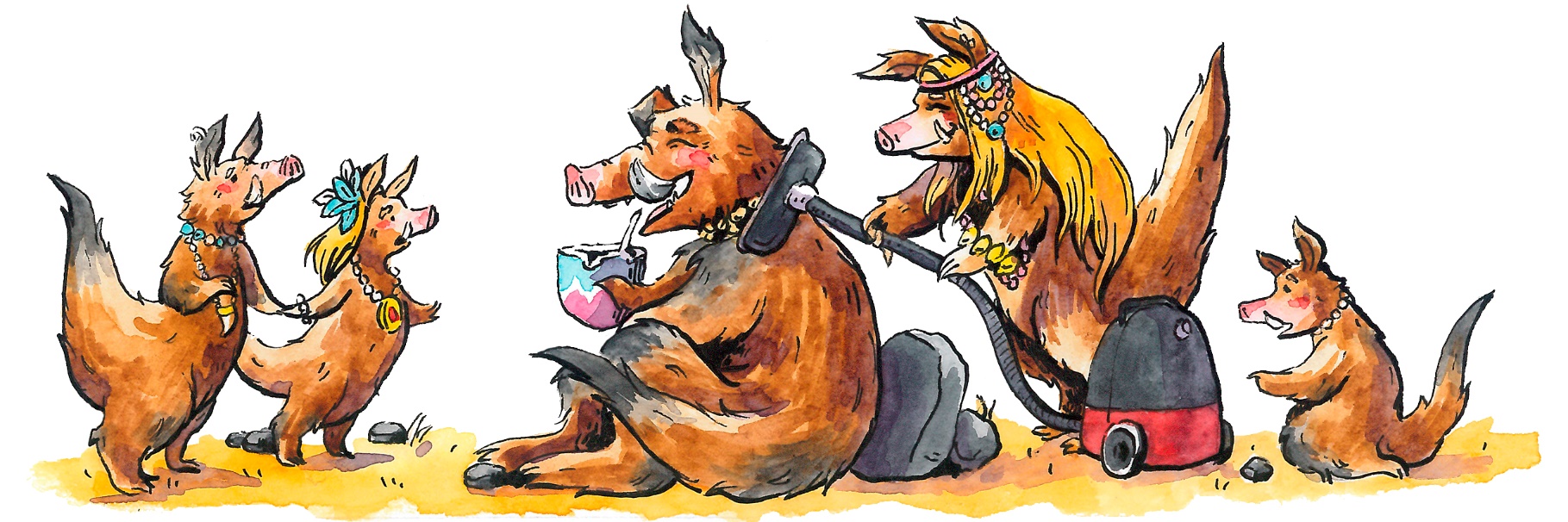 Мудрейшина недоверчиво покрутил пылесос в лапах, посмотрел в шланг, шумно понюхал. Когда короткий когтистый палец нажал на кнопку и пылесос загудел, Мудрейшина вздрогнул и выронил подарок. Но робко наклонившись к нему и приглядевшись, он наконец просиял, гордо поднял пылесос над головой и ликующе захрюкал. Племя кабанозавров ответило ему восторженным хрюкающим хором.