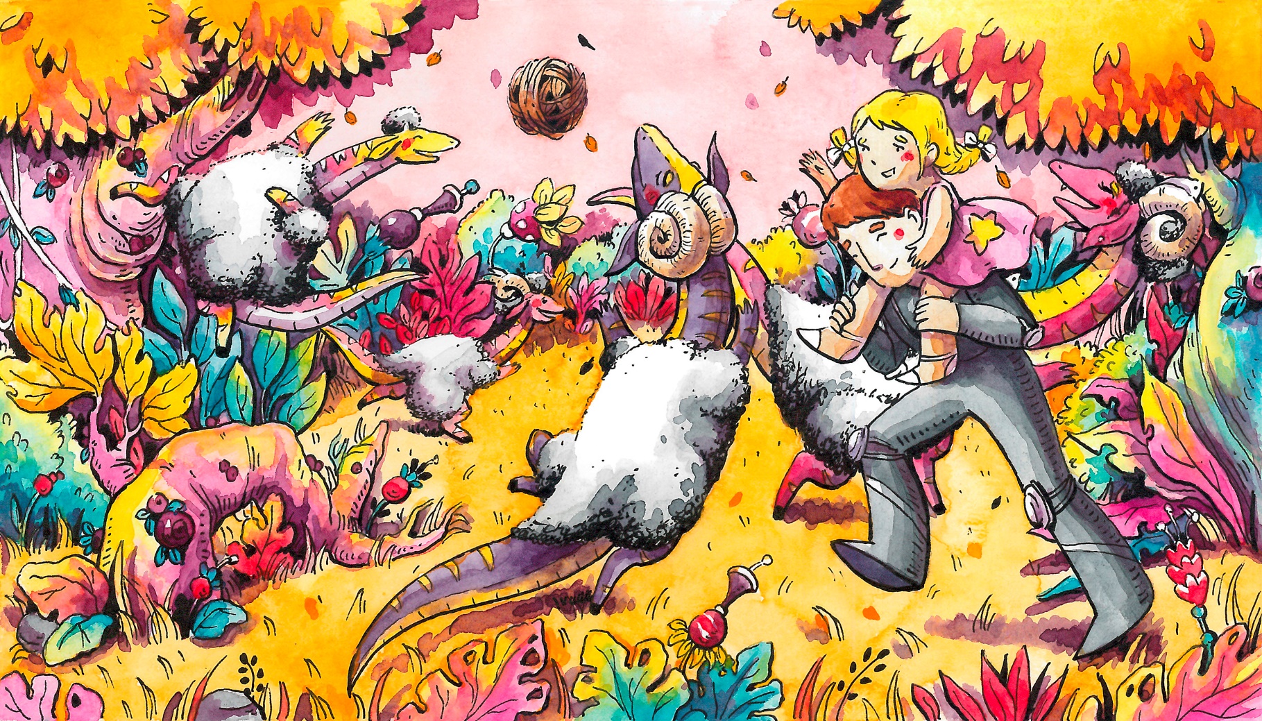 День выдался замечательный – закатное солнце разукрасило облака в нежные сиренево-розовые цвета. Лёгкий ветерок лениво раскачивал верхушки деревьев, срывая листья и устилая ими бордовую траву. На опушке леса, возле родной деревни, баранозаврята Бебеслав, Бебелла, и малыш Беня, запрокинув голову, махали лапами улетающему космическому кораблю. Бебелла всхлипывала, вытирая слёзы. Бебеслав нежно обнимал сестру. Беня же мечтал о там, как он тоже полетит в космос, будет путешествовать от планеты к планете, искать приключения и заводить друзей. Он украдкой поглядывал на тропинку, бегущую к ручью, возле которого, скрытый от любопытных глаз листьями и лианами, ждёт его космический корабль “Птеранодон”.