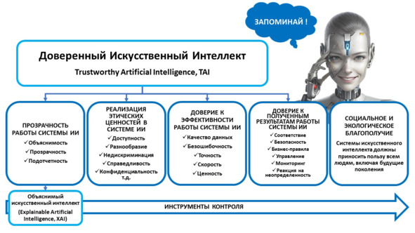 Доверенный или надежный искусственный интеллект (Trustworthy Artificial Intelligence, TAI) – это прикладная система искусственного интеллекта, обеспечивающая выполнение возложенных на нее задач с учетом ряда дополнительных требований, учитывающих этические аспекты применения искусственного интеллекта, а также обеспечивающая доверие к результатам работы системы ИИ, которые включают в себя: Достоверность (надежность) и интерпретируемость выводов и предлагаемых решений, полученных с помощью системы и проверенных на верифицированных тестовых примерах. Безопасность как с точки зрения невозможности причинения вреда пользователям системы на протяжении всего жизненного цикла системы, так и с точки зрения защиты от взлома, несанкционированного доступа и других негативных внешних воздействий. Приватность и верифицируемость данных, с которыми работают алгоритмы искусственного интеллекта, включая разграничение доступа и другие связанные с этим вопросы276.