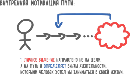 Основным элементом, создающим третий тип мотивации, является личное видение. В отличие от конечных целей, удовлетворение от достижения которых снижает гедоническая адаптация, этот тип мотивации дает долгосрочное удовлетворение. Личное видение содержит ответ на вопрос, чему человек хотел бы посвятить время своей жизни. Оно направлено на деятельность, а не на результат. Сфокусировано на пути, а не на цели. Как гласит мудрость, «и путь может быть целью».
