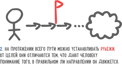 Для наполнения видения необходимо поставить своего рода рубежи. Их достижение дает нам понять, что мы на правильном пути и действительно объективно продвигаемся вперед. Разница между целью и рубежом в том, что при мотивации целью действия человека направлены непосредственно на достижение цели как таковой. Рубеж же является только вспомогательным элементом, промежуточным пунктом, дающим нам обратную связь, понимание, верной ли дорогой мы идем.