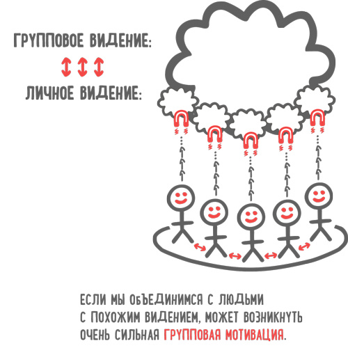 Если мы окружены людьми с аналогичным видением, то можем объединиться и создать сообщество. Групповая мотивация, возникающая благодаря этому, только усилит эффект нашего личного видения.