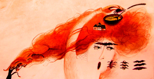 …И вот насыплет Колдуша в котёл, что под руку попадётся: старой пыльной паутины, колючек, соли, перца, сухого мышиного помёту, червивых грибов. Иной раз от лени даже и не глянет, что в котёл бросает, и мешает всё это огромной поварёшкой.