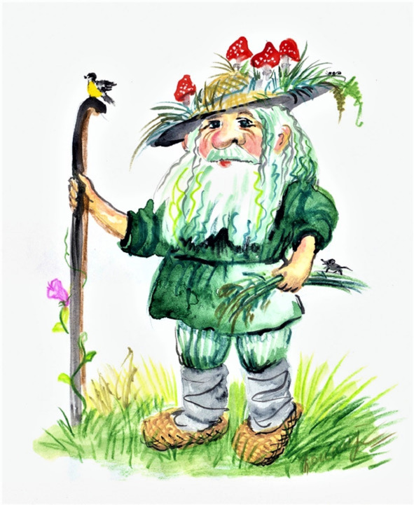 Вдруг послышалось кряхтение, на поляну вышел дед в зелёной латаной рубахе. На ногах – лапти, волосы – косматые, на голове мухоморы, а в бороде колокольчики лесные растут.