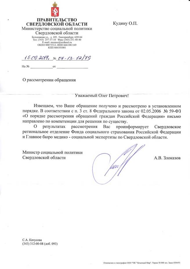 В соответствии с Федеральным законом от 2 мая 2006 года № 59-ФЗ «О порядке рассмотрения обращений граждан Российской Федерации» 04 сентября 2014 года я обратился в Правительство Свердловской области с просьбой объяснить мне, почему ФКУ "ГБ МСЭ по Свердловской области" бюро № 43 г. Первоуральска оформляя мне 30.10.2012 года, Индивидуальную программу реабилитации инвалида (ИПР) бессрочно, указала в разделе Технические средства реабилитации иуслуги по реабилитации ТСР без учета требований Приказа Министерства здравоохранения и социального развития Российской Федерации от 7 мая 2007 г. N 321 "Об утверждении сроков пользования техническими средствами реабилитации, протезами и протезно-ортопедическими изделиями до их замены" (в настоящее время принят Приказ Минздравсоцразвития РФ от 27.12.2011 N 1666н "Об утверждении Сроков пользования техническими средствами реабилитации, протезами и протезно-ортопедическими изделиями до их замены"), без учёта рекомендаций изложенных в письме от 5 мая 2006 г. N 2317-ВС Министерства здравоохранения и социального развития Российской федерации «Методические рекомендации по обеспечению инвалидов техническими средствами реабилитации в рамках федерального перечня реабилитационных мероприятий, технических средств реабилитации и услуг, предоставляемых инвалиду (предназначены для специалистов федеральных учреждений медико-социальной экспертизы)».