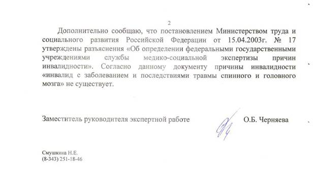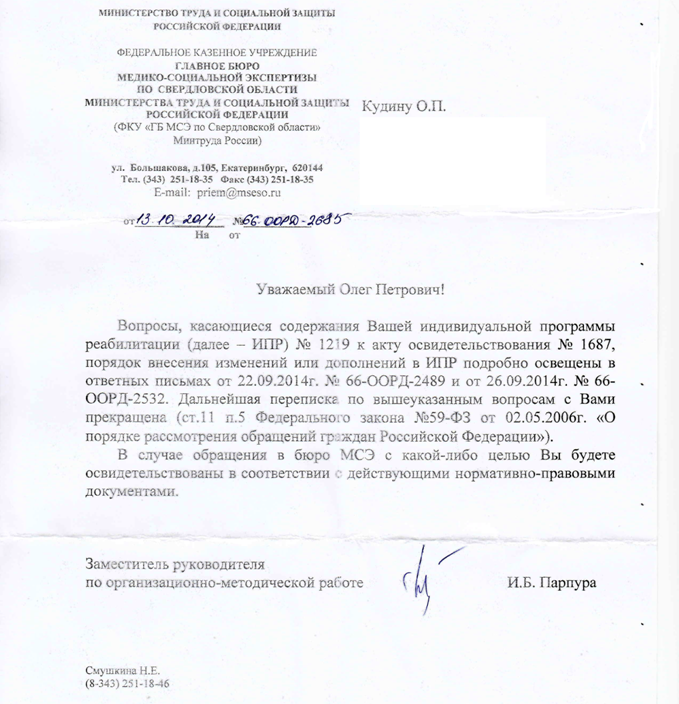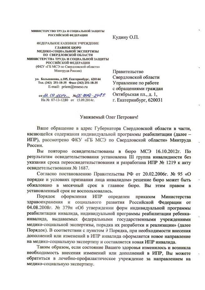 В своем ответе ФКУ «ГБ МСЭ по Свердловской области» от 22.09.14 г. № 6600РД-2489 мне снова предлагает пройти все круги ада, чтобы повторно мне оформить ИПР не смотря на то, что при оформлении моей ИПР председатель бюро № 43 г. Первоуральска Голикова нарушила все существующие федеральные нормативные акты, не говоря о нормах человеческой морали. Спасибо Вам большое за понимание, но сначала нужно навести порядок в подведомственных учреждениях.