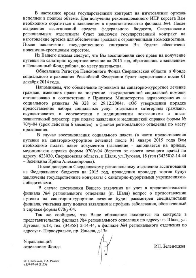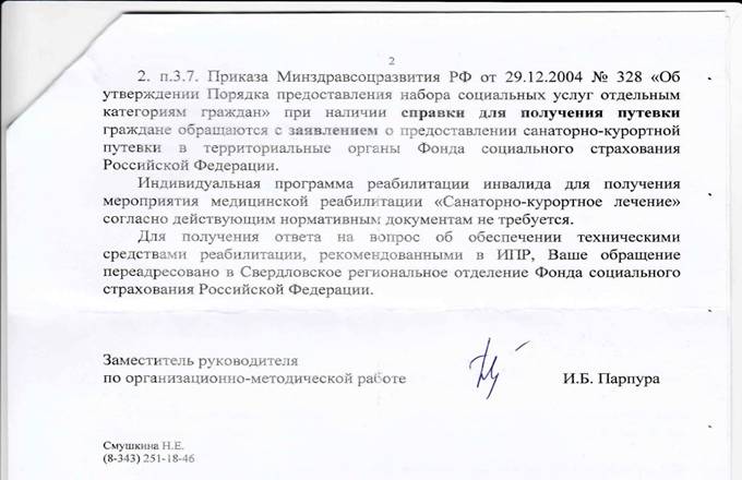 Ранее полученное Вами обращение было направлено 15.09.2014 г № 07-13-12/79 в ФКУ «ГБМСЭ по Свердловской области», с ответом полученным 22.09.14 г. № 6600РД-2489 я согласен только частично в части указания причины инвалидности "общее заболевание" без указания самого заболевания. Единственный вопрос на который я не получил ответ в данной части, как мне должны быть определены дни санаторно-курортного лечения, на основании какого документа, если в соответствии с Федеральным законом «О государственной социальной помощи» Статья 6.2. п3. Длительность санаторно-курортного лечения в рамках предоставляемого гражданам набора социальных услуг в санаторно-курортной организации составляет 18 дней, для детей-инвалидов – 21 день, а для инвалидов с заболеваниями и последствиями травм спинного и головного мозга – от 24 до 42 дней.