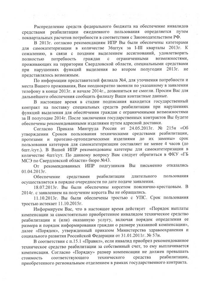 В повторном ответе ФКУ «ГБМСЭ по Свердловской области», от 26.09.14 г. № 66-00РД-2532не чего не сказано о факте нарушения требований федеральных нормативных актов ФКУ "ГБ МСЭ по Свердловской области" бюро № 43 г. Первоуральска при составлении мне ИПР N 1219 (бессрочно) в части указания ТСР. Оформляя ИПР бессрочно г-жа Голикова в отличии от меня, прекрасно знала Приказ Министерства здравоохранения и социального развития Российской Федерации от 7 мая 2007 г. N 321, письмо от 5 мая 2006 г. N 2317-ВС тем не менее вписала в ИПР в разделе ТСР: корсет пояснично-кресцовый полужесткий – без срока и количества штук в год; трость опорная – без сроков и количества штук в год это значит что я должен всем этим пользоваться до конца жизни, так же с таким же успехом, чтобы быть до конца верной себе можно было вписать в ИПР и катетер для самокатетеризации лубрицированный и подгузник для взрослых размер М по одной штуке до конца жизни, чтобы я по мере необходимости все бегал со справками по коридорам МСЭК № 43 г. Первоуральска.
