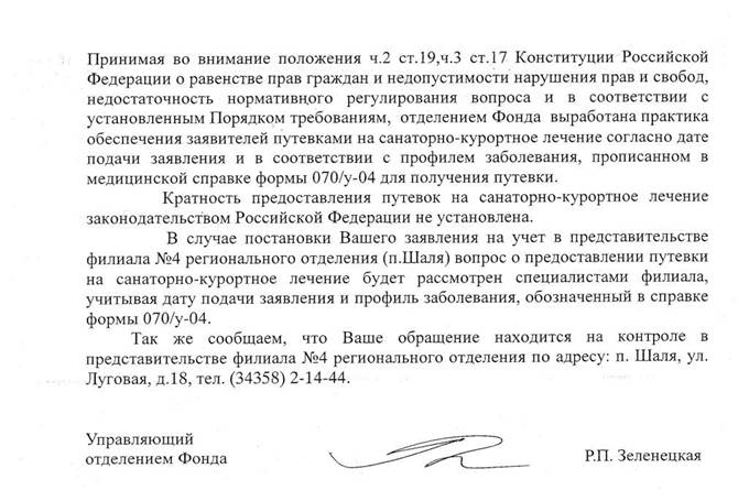 В настоящее время я оформил необходимые заявления в ПФР по поводу обеспечения санаторно-курортным лечением и приобрету, данное право с 2015 года, но у меня имеются опасения смогу или нет, я получить необходимую путевку в соответствии практикой обеспечения заявителей путевками на санаторно—курортное лечение или я снова буду вынужден писать жалобы? 03 октября 2014 года О.П.Кудин