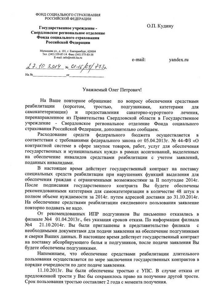 В ответе № 01–16/08/751л от 02.10.2014 года ФСС указал, что я был обеспечен катетерами только за 3 квартала 2013года, в году у нас 4 квартала и очевидно последний 4 квартал я был обязан их приобретать за свой счет. В первом полугодии 2014 года в списки получателей данных ТСР я снова не попал, и поэтому мне остаётся надеяться только на то, что после моей очередной жалобы про меня ФСС снова вспомнит и выдаст мне необходимые ТСР уже в конце 2014 года.