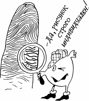 Этот рисунок для каждого человека строго индивидуален и постоянен. Он возникает на пальцах человеческих эмбрионов еще за три месяца до их рождения и сохраняется всю жизнь. Так как рисунок на пальцах рельефный, а наша кожа всегда покрыта тончайшим слоем выделений кожных желёз, их прикосновение оставляет на гладких предметах отпечаток. Поэтому у всех людей, совершивших какое-нибудь преступление, обязательно снимают отпечатки пальцев и хранят их в специальных картотеках, а на месте совершения тяжких преступлений криминалисты прежде всего ищут следы рук преступников и сличают их с имеющимися в картотеке.
