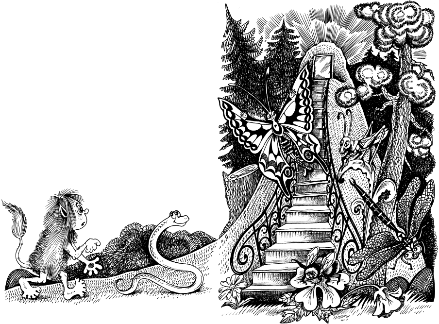 Змея лениво прикрыла правый глаз, потом вновь широко открыла его, словно подмигнула, и заскользила через лужайку к холму, Аля – следом. Они поднялись на вершину по мраморной лестнице с изящными перилами. И вот лестница упёрлась в золотую дверь, которая не замедлила распахнуться настежь.