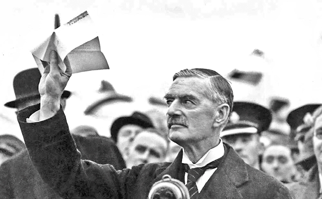 Премьер-министр Великобритании Невилл Чемберлен демонстрирует текст Мюнхенского соглашения со словами: «Я привёз мир для нашего поколения!»
