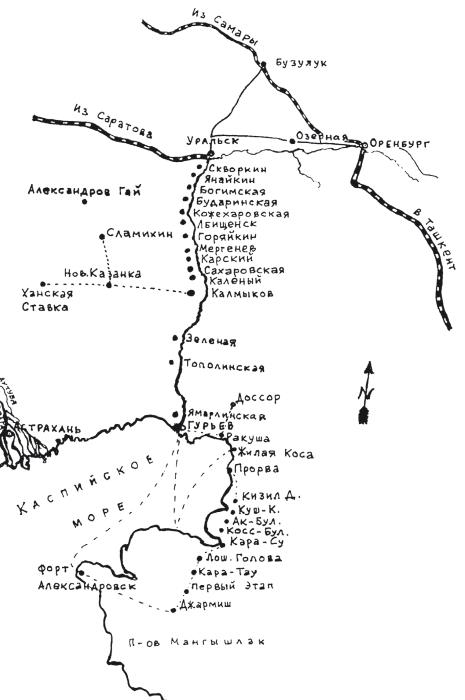 К концу 1919 года в одной из отдалённых областей необъятной России имели место события исключительные по своему значению в ходе гражданской войны. Уральская область[7], её географическое положение, её история, своеобразие нравов и обычаев её населения – уральских казаков, к сожалению, нам мало, недостаточно знакома. Не имея возможности дать полную картину событий на Урале во второй половине 1919 года, я коснусь лишь описания области постольку, поскольку это необходимо в интересах полноты и ясности этой картины. По месту описываемые ниже события относятся к долине реки Урала от устья (станица Гурьев) до станицы Уральск, к северному и частью восточному побережью Каспийского моря, вернее от Гурьева через Ракушу, Прорву, южную оконечность залива Кайдака (Кара-су) и далее через весь Мангышлакский полуостров до Форта Александровского. По времени эти события охватывают период с июля 1919 по февраль 1920 года. Мне хотелось бы с возможной для участника и наблюдателя событий объективностью обрисовать последний период истории борьбы уральцев с большевиками, относящийся к декабрю 1919 и январю и февралю 1920 годов. Он слагается из вынужденного оставления Уральской армией и населением своей родины и совершенного ими беспримерного похода из Гурьева в Форт Александровский в суровую пору года, в неописуемо тяжких условиях.