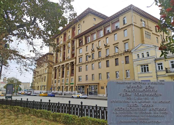 На Никитском бульваре в Москве стоит дом, построенный в 1936 г. для работников Главсевморпути. Полярники в то время воспринимались так, как в 1960-е гг. космонавты, ведь Арктика тогда была символом недоступности. Здесь жил весь лётный состав, асы, в том числе и полярный лётчик, Герой Советского Союза Анатолий Дмитриевич Алексеев (илл. 74).