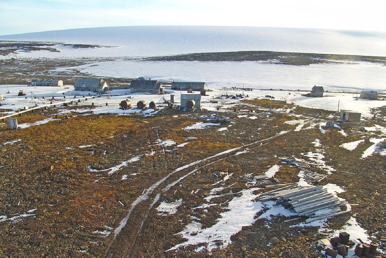 Илл. 48. Полярная станция «Остров Рудольфа» – база авиагруппы экспедиции к Северному полюсу. На заднем плане ледяной купол, на котором располагался в 1937 г. аэродром. Вид с вертолёта. Фото П. В. Боярского. МАКЭ, 2007 г.