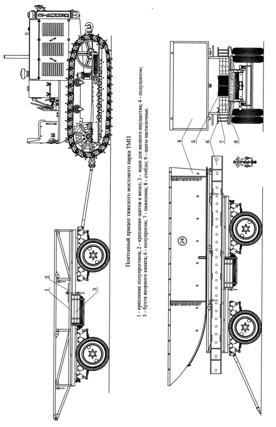 Тяжелый понтонно-мостовой парк ТМП являлся табельным переправочным средством и обеспечивал оборудование мостовых и паромных переправ под грузы до 100 тонн, на реках со скоростью течения до 3 м/с. Из имущества парка собирались наплавные мосты грузоподъемностью 16, 50, 60, 100 тонн и перевозные паромы грузоподъемностью 16, 20, 30, 50, 70 и 100 тонн. Мосты грузоподъемностью 100 тонн были двухпутными, грузы весом свыше 50 т двигались по мосту только в одном направлении. В парке ТМП обр. 1952 г. собирались мосты грузоподъемностью 16, 50, 70 тонн и паромы 16, 35, 50 и 70 тонн..