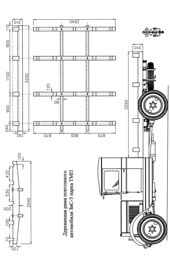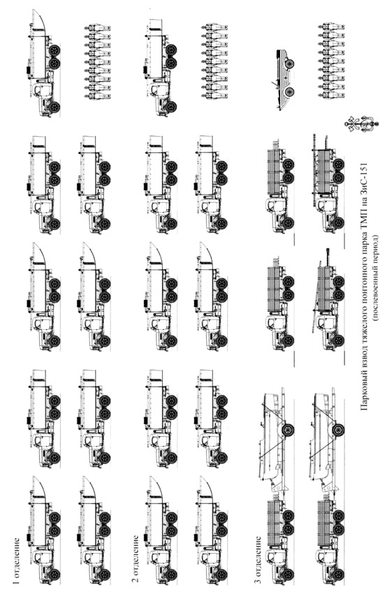 Материальная часть была распределена с расчетом, чтобы из элементов перевозимых на четырех понтонных автомобилях, можно было собрать один 50-т мостовой паром.