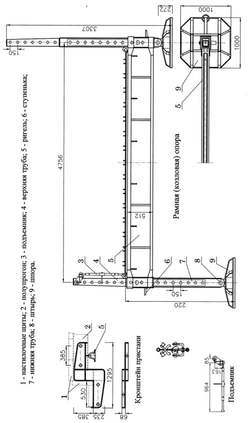 Для устройства пристаней использовалась рамная (козловая) опора, которая состояла из ригеля, двух стоек и двух подъемников с кронштейнами и предназначалась для устройства береговых пролетов на мелководье а также пристаней. Барабанная опора в основном использовалась для устройства пристаней. Береговой лежень предназначался для устройства береговой опоры.