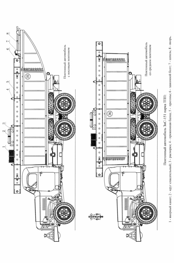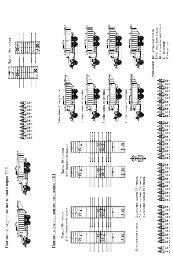 На двух понтонных автомобилях перевозились все элементы для сборки 5 погонных метров 50-тонного моста. Для сборки перевозных 16-т перевозного парома требовалось четыре понтонных автомобиля, 35-т – шесть, 50-т – восемь понтонных автомобилей.