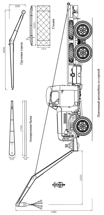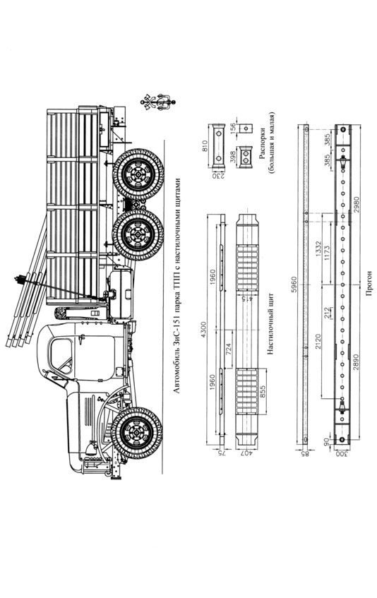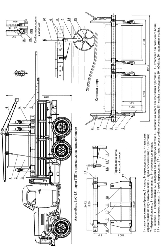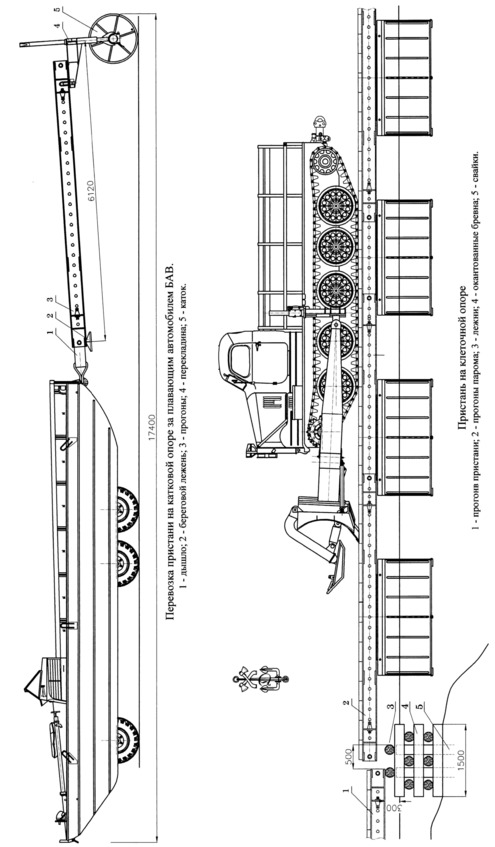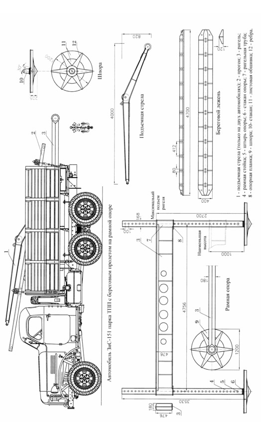 На настилочном автомобиле перевозилось 16 настилочных щитов. На автомобилях с береговыми опорами перевозилось по одной рамной или катковой опоре.