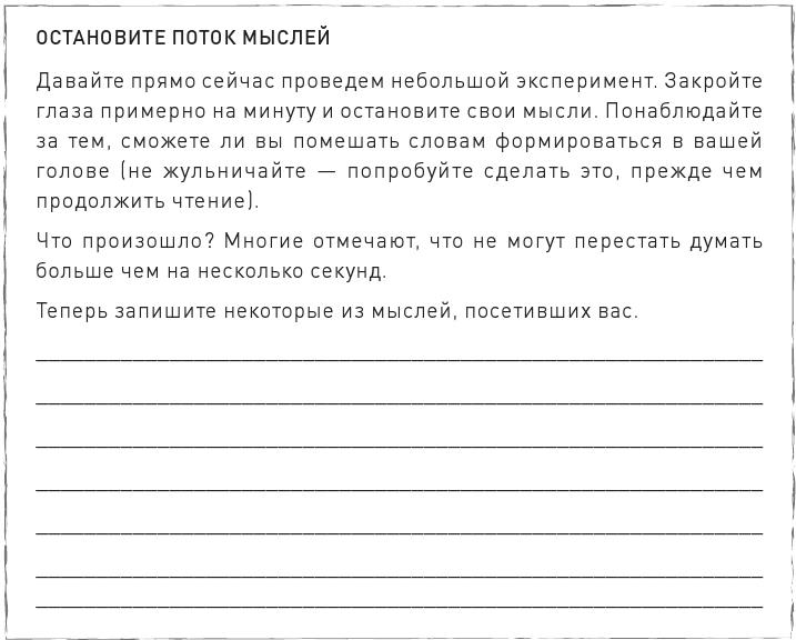 Так мы и живем – погруженные в раздумья, размышляя о жизни чаще, чем проживая ее. Но то, что мы упускаем изобилие каждого момента нашей жизни, – не самая большая проблема. К сожалению, наши мысли часто делают нас несчастными. Все мы страдаем от так называемой мыслительной болезни: в нашем стремлении чувствовать себя хорошо мы думаем обо всех возможных вариантах событий, которые могут заставить нас почувствовать себя плохо. Иногда это полезно, но зачастую это все же порождает ненужные страдания, ведь любые негативные мысли, связанные с будущим, повышают уровень напряжения или усиливают боль.