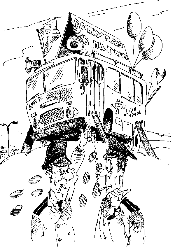 Переменными ходами и курсами дошли мы до автобуса. А он, гад, закрыт. Если вы думаете, что на этом мы сдались, то вы сильно недооцениваете целеустремлённость и упорство людей, которые берегли ваш покой, не получая зарплату по четыре месяца подряд. Сломали мы дверь этому бедному ПАЗику и попали, так сказать, в передвижной партийный храм. Там столик, на нём кучка удостоверений, журнал регистрации членов… и никого.