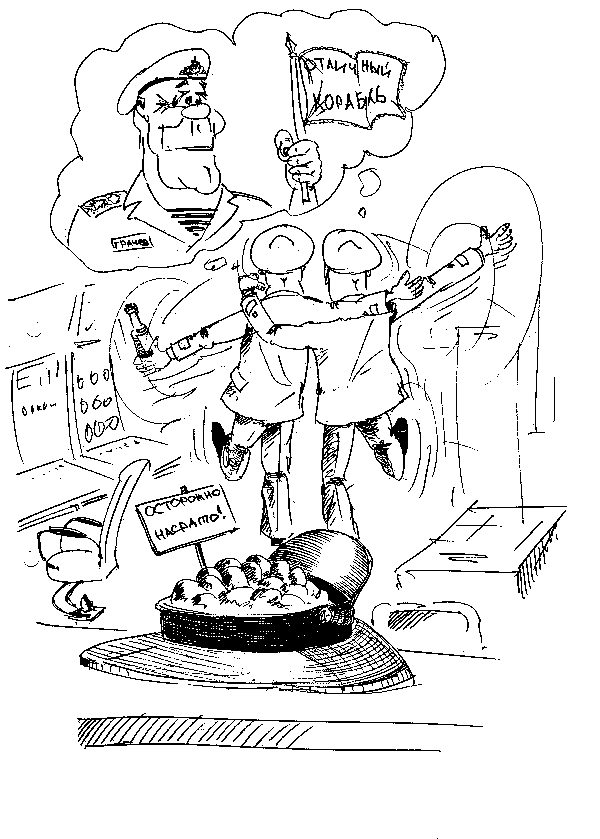 К двум на отдых прибыл командир (стоял дежурным по дивизии). Увидел эту подозрительную кучу в углу центрального.