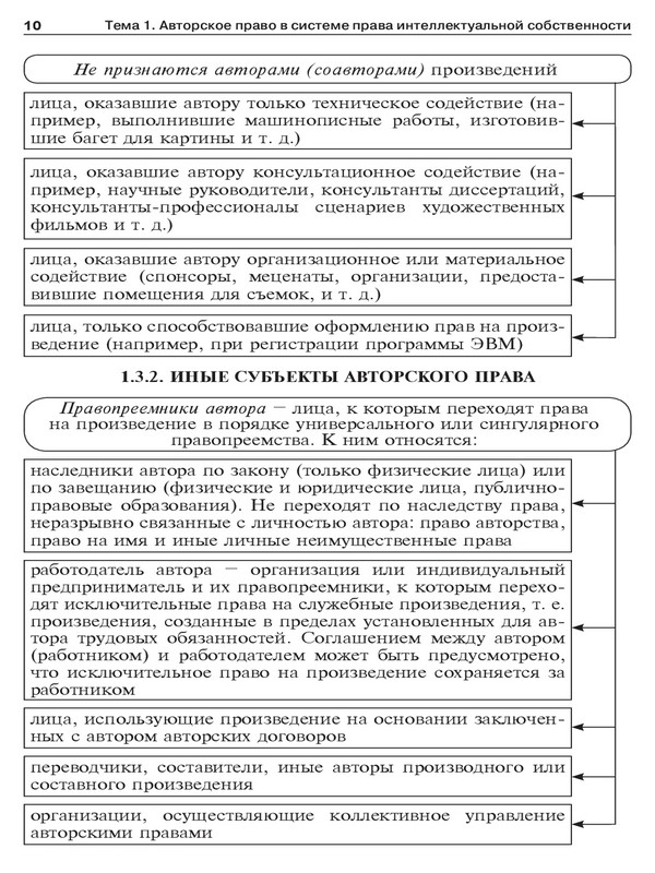 Материалы, отраженные в схематических конструкциях, предназначены как для закрепления теоретических знаний, так и для подготовки к практическим занятиям по соответствующему курсу, особенно при выполнении заданий на логическую последовательность. Для более глубокого изучения теории и практики авторского права, его основных проблем и дискуссионных аспектов к схемам прилагается список литературы, в который включены как общетеоретические работы, так и работы, посвященные отдельным вопросам авторского права.