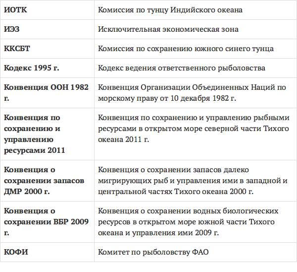 Запасы биологических ресурсов Мирового океана практически неисчерпаемы7. Однако государства должны эксплуатировать их разумно, на основе предосторожного и экосистемного подходов. Но рациональному использованию ресурсов непоправимый ущерб наносит незаконный, несообщаемый и нерегулируемый промысел (далее – ННН промысел), который имеет место практически во всех районах Мирового океана – как в зонах национальной юрисдикции, так и в открытом море. Одни рыбаки не соблюдают правила рыболовства, другие – запретные для промысла сезоны и районы, третьи не сообщают (или сообщают недостоверную информацию) о своих уловах. Владельцы некоторых судов меняют флаг государств, которые не могут или не хотят должным образом контролировать промысловую деятельность судов. Такой промысел подрывает национальные и международные меры по сохранению водных биоресурсов и управления ими и ведет к истощению ресурсов. По данным ФАО, 32,5 % запасов морских рыб уже отлавливается чрезмерно. Большинство из 23 запасов тунца эксплуатируется полностью. В долгосрочной перспективе из-за высокого спроса на тунца и значительного избытка добывающих мощностей тунцеловного флота состояние запасов тунца может и далее ухудшаться, если не будет вестись борьба с браконьерским промыслом.