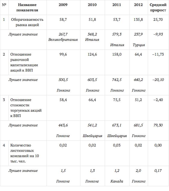 Как видно из табл. 1.1, российский фондовый рынок демонстрирует существенно более низкие финансовые показатели, чем рынки-лидеры. Причем в период с 2009 по 2012 г. динамика финансовой глубины рынка акций отрицательна. Оборачиваемость рынка акций повысилась, однако относительное число листинговых компаний стабильно.