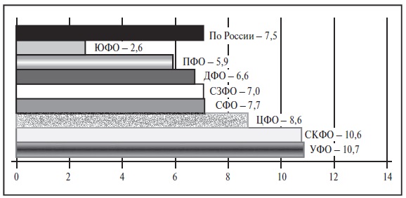 Подсчет коэффициентов организованной преступности в различных федеральных округах позволяет сделать вывод о стабильно сложной криминальной ситуации в Северо-Кавказском федеральном округе. Это объясняется оказанием активного воспрепятствования осуществлению правосудия со стороны ОГ и ПС с использованием любых противоправных приемов и способов, в том числе вооруженного сопротивления органам государственной власти. Высокого уровня напряженности достигла криминальная ситуация, связанная с деятельностью организованных преступных формирований в Уральском федеральном округе. Традиционно высок коэффициент организованной преступности в Центральном и Сибирском федеральных округах, где этот показатель выше, чем в целом по стране (рис. 5).