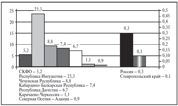 Обращает на себя внимание характерная для Северного Кавказа эскалация насилия в отношении представителей органов государственной власти, являющегося взаимосвязанным с террористической деятельностью явлением. Коэффициент распространенности преступлений, предусмотренных ст. 317 УК РФ, в Республике Ингушетия в 2008–2012 гг. составил более 23 фактов на 100 тыс. населения старше 14 лет и является самым высоким по значению в Росси. Далее субъекты СКФО ранжируются по коэффициенту преступности следующим образом: Чеченская Республика (8,8), Кабардино-Балкарская Республика (7,4), Республика Дагестан (6,7), Карачаево-Черкесская Республика (1,1), Республика Северная Осетия – Алания (0,9). В Ставропольском крае этот коэффициент менее 0,1 факта на 100 тыс. населения старше 14 лет (рис. 6).